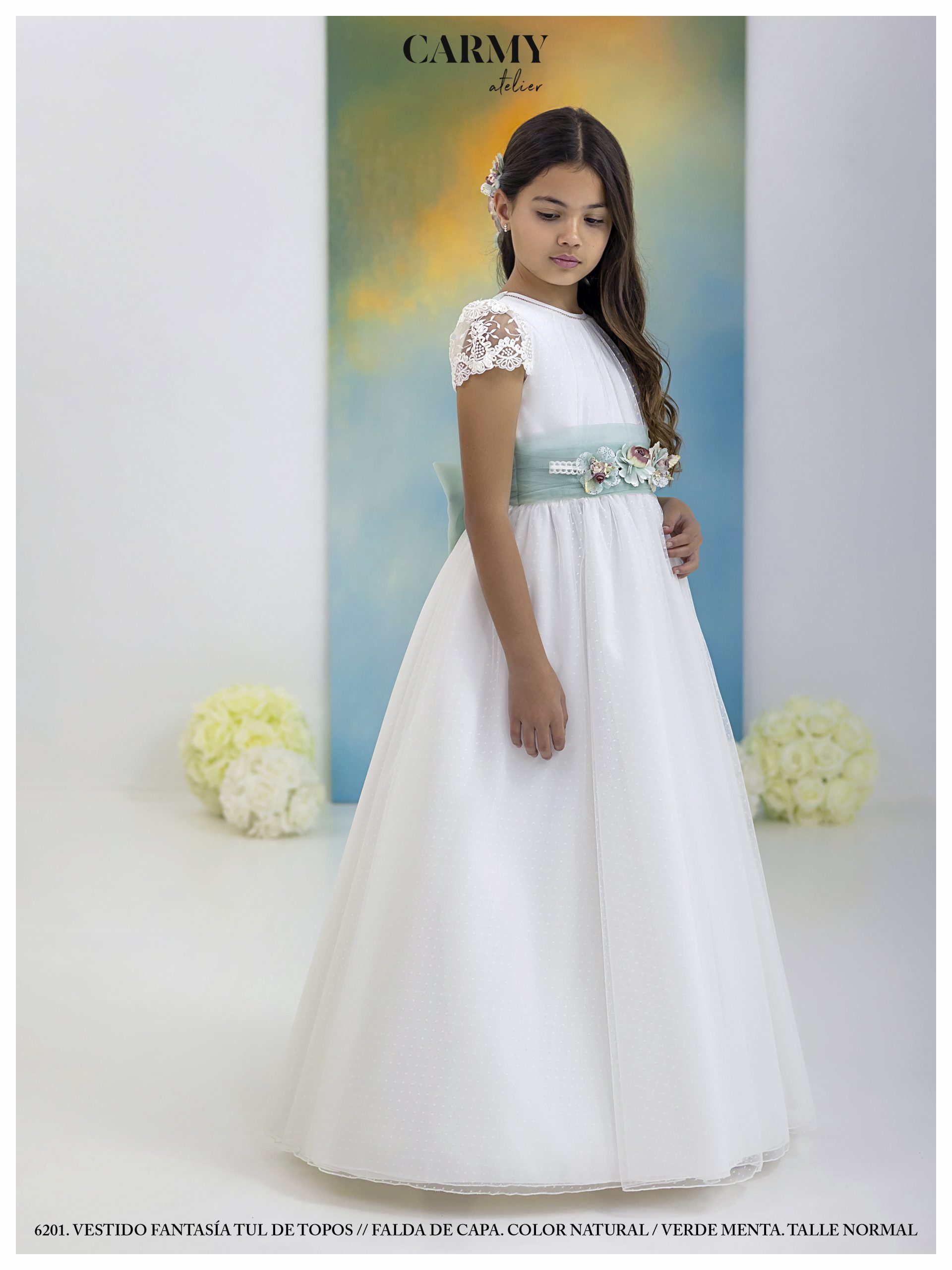 Vestido de comunión elaborado en delicado tul con topos en color natural. El cuerpo presenta un escote redondo en el frente y espalda en pico con puntilla, añadiendo elegancia. Sus mangas cortas también llevan puntilla, complementando el diseño. Incluye un cinturón de tul verde adornado con flores y un lazo en la parte trasera, creando un conjunto romántico y sofisticado perfecto para la ocasión especial.