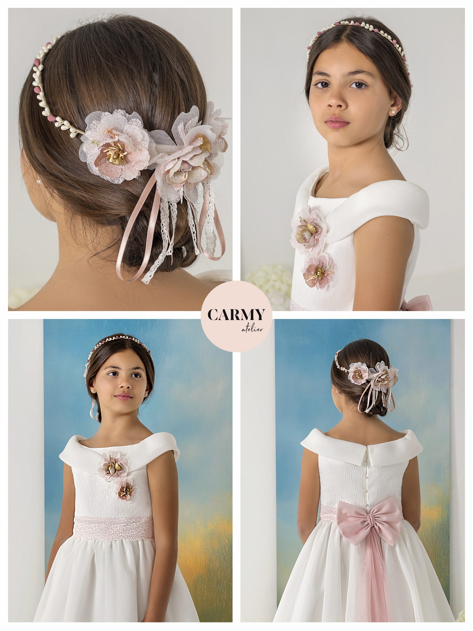 Vestido de comunión en organza rústica de color natural, elegante y delicado. Su escote barco con cuello aporta sencillez y sofisticación, mientras que la cintura adornada con puntilla y tul rosa debajo realza la silueta. El cuerpo presenta un hermoso adorno de flores, complementado con un lazo en la espalda que aporta un toque romántico y encantador. Perfecto para una ocasión especial, combinando tradición y estilo en cada detalle.