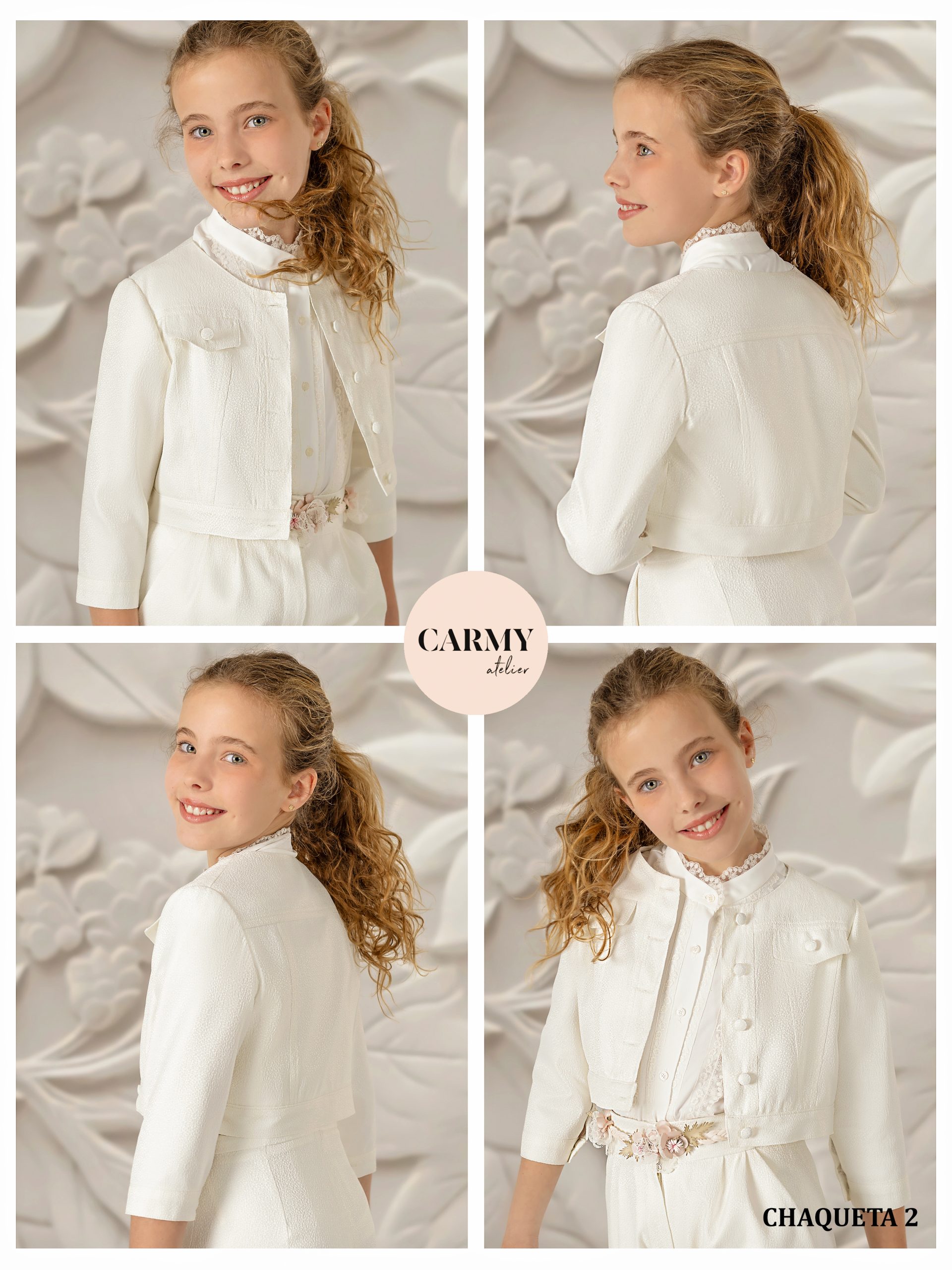 Elegante chaqueta en color marfil que combina con cualquier vestido y a la vez una prenda versátil para que el día de su primera comunión vaya elegante y poder utilizarla en más ocasiones.